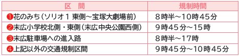 コースの周辺・路上の車両通行と駐停車を禁止します。また、当日8時半~17時は末広駐車場の一般利用はできません。