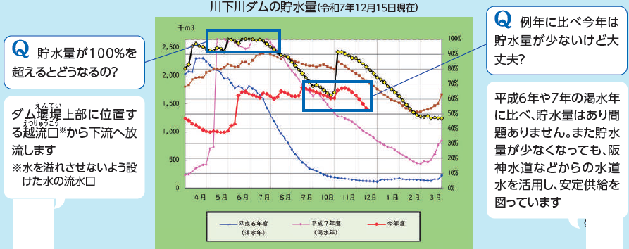 ※貯水池では、雨が降った時に多量の水を貯えることで、雨が降らない時期でも必要な量を確保しています