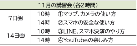 申込み:はがきまたはファクスで、〒住所、名前、生年月日(同一世帯から複数参加の場合は全員分)、電話番号、希望の講座番号(複数受講可)を記入し、〒665-8665(住所不要)情報政策課「スマホ講習会係」へ。10月10日(金)必着