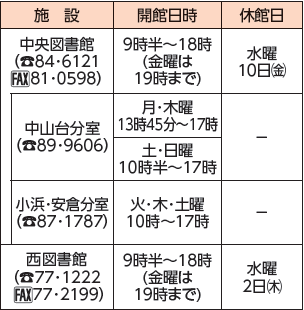 内容:予約図書の貸し出し。※図書館の利用券で同センター図書室の蔵書の貸し出しはできません