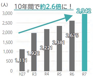 外国人住民は、令和7年10月時点で2,900人を上回り、10年前の2・6倍に増えました。市民のおよそ4%を占め、約50ヵ国の外国人住民が生活しています。平成31年には、国が深刻化する人手不足に対応するため在留資格「特定技能」を創設したことで、製造業や介護、農業など、地域の幅広い分野で活躍しています。家族とともに定住する人も増え、外国人の子どもたちも多くなりました。一方で、急速な増加により、言葉や生活習慣の違いから生じるさまざまな課題が顕在化しており、今後は誰もが安心して暮らせる地域づくりがより一層求められています。