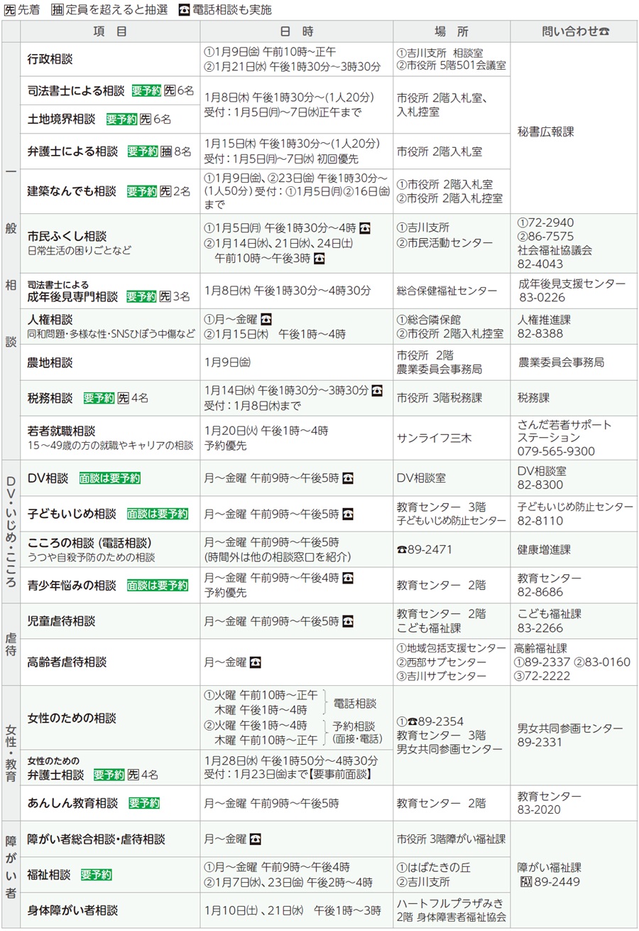 くらし 相談 14/34 前の記事 次の記事 記事を読み上げる 発行日 : 2026年01月03日 自治体名 : 兵庫県三木市 広報紙名 : 広報みき 2026年1月号 ■相談窓口 ◇他の相談は各課の窓口で受け付けています。まずは電話で問い合わせてください。 ・ 相談の詳細はホームページで確認または問い合わせてください ※本紙二次元コードよりご覧ください。 Tweet シェアする 健康のページ 教室・講座(1)