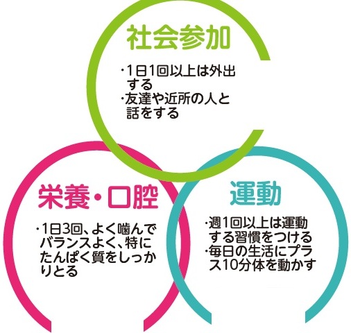 フレイルを予防するポイントは、「社会参加」「運動」「栄養・口腔」をバランスよく実践することです。