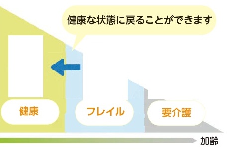 年齢とともに心身の機能が衰え始める状態をフレイルといいます。体力や気力、口腔機能が少しずつ低下し、放っておくと介護が必要になるリスクが高まります。多くの人は、このフレイル状態を経て要介護状態に陥りますが、早めに気づき、生活習慣の改善や適切な治療によって、再び健康な状態に戻ることができるのも大きな特徴です。