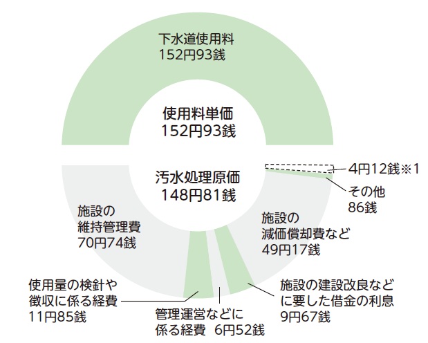 汚水処理原価:汚水処理費÷有収水量=1立方メートル当たりの汚水を処理するために必要な費用