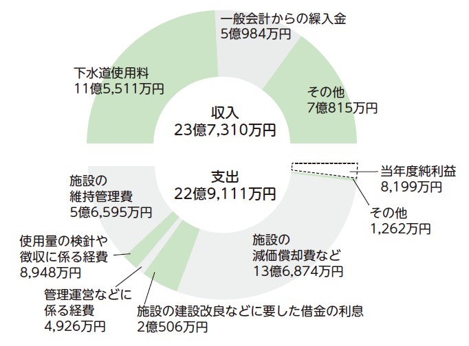 収入は下水道へ排出される水量の増加に伴い、下水道使用料が増加し、一般会計からの繰入金やその他の収入などにより、総額23億7,310万円となりました。