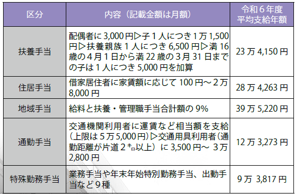 扶養・住居・通勤手当や時間外勤務手当の他ボーナスに当たる期末・勤勉手当などがあります