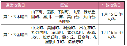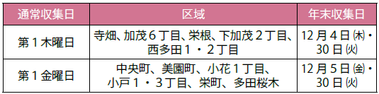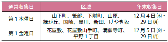 第1木・金曜日の区域は、下表2・3の通り(12月の収集が2回となり、1月はありません)。その他の区域は通常通りです。