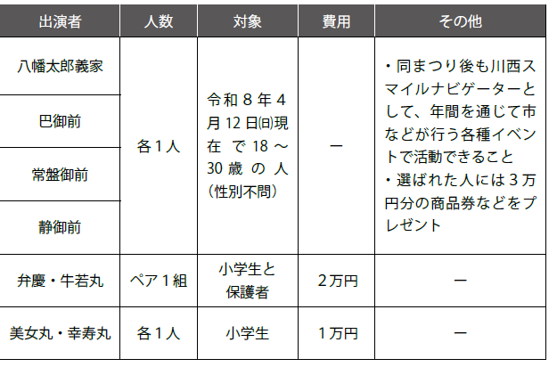 弁慶・牛若丸役、美女丸・幸寿丸役は、応募多数の場合は抽選となります。当選者には、3月中旬に当日の案内と入金方法をメールで連絡します。