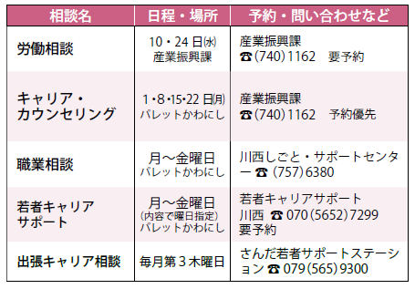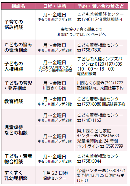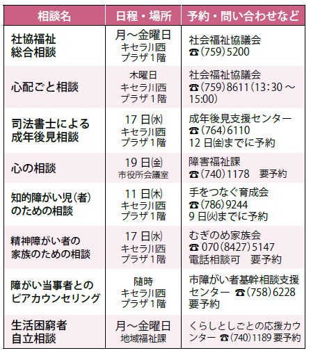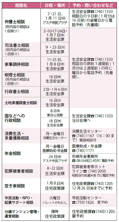 ※原則、祝日・振替休日は実施しません。相談内容や時間、定員など詳しくは予約・問い合わせ欄に記載の担当課へ問い合わせてください。
