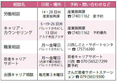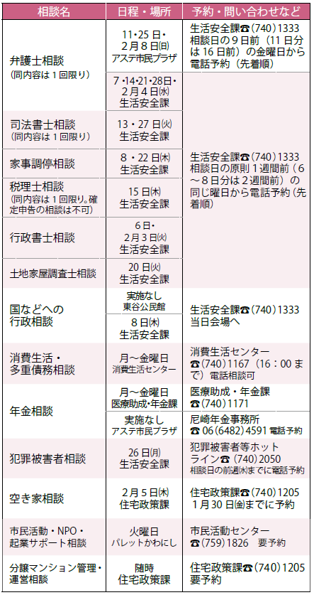 ※原則、祝日・振替休日は実施しません。相談内容や時間、定員など詳しくは予約・問い合わせ欄に記載の担当課へ問い合わせてください。市外局番は072です。