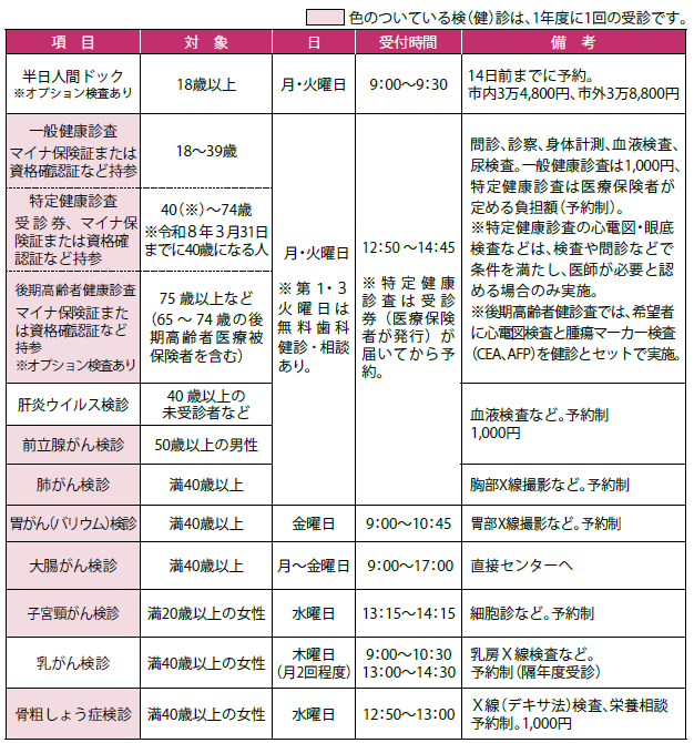 ※オプション検査の内容:半日人間ドックは胸部CT撮影検査1万1,000円、胃カメラ検査3,000円、骨密度検査1,000円(要別途料金)。後期高齢者健康診査は心電図検査1,300円、腫瘍マーカー検査2,300円(要別途料金)
