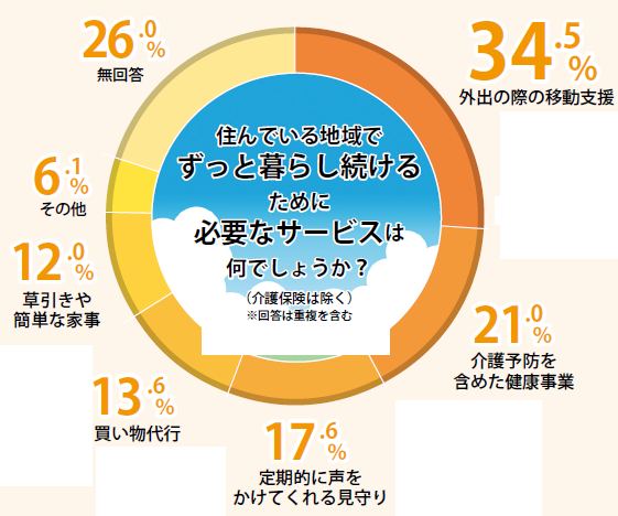 地域で暮らし続けるために最も必要としているサービスは「外出の際の移動支援」でした。これは、坂が多い川西の土地柄が背景にあり、移動に困難を感じている人が多いからだと考えられます。
