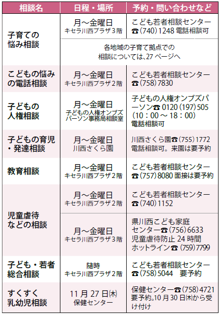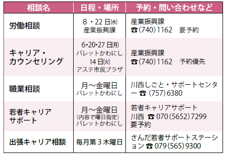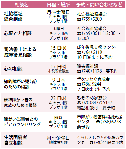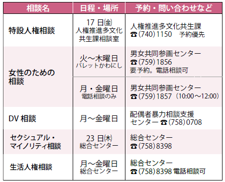 ※原則、祝日・振替休日は実施しません。相談内容や時間、定員など詳しくは予約・問い合わせ欄に記載の担当課へ問い合わせてください。