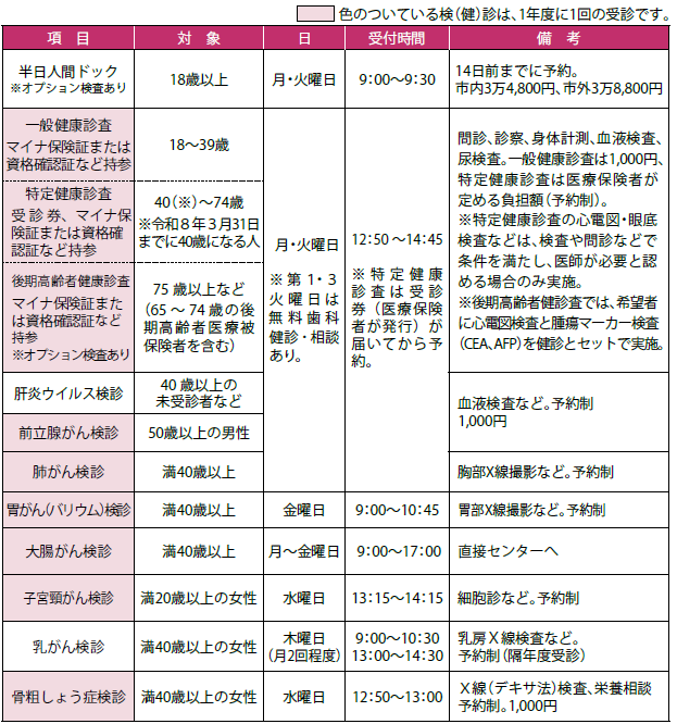 ※オプション検査の内容…半日人間ドックは胸部CT撮影検査1万1,000円、胃カメラ検査3,000円、骨密度検査1,000円(要別途料金)。後期高齢者健康診査は心電図検査1,300円、腫瘍マーカー検査2,300円(要別途料金)
