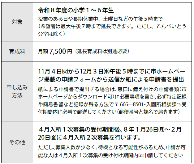 小学校の放課後、就労などで家庭に保護者のいない児童を育成支援する「留守家庭児童育成クラブ」。令和8年度入所児童を募集します(下表参照)。
