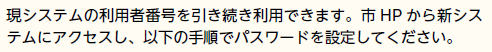 11月28日9時から新しい公共施設予約システムの運用を開始します。施設利用日が8年4月1日以降の場合は、新システムをご利用ください。11月24日時点で現システムの利用者登録が有効な人は、新規登録不要で新システムを利用できます。以下の手順でパスワード設定をお願いします。