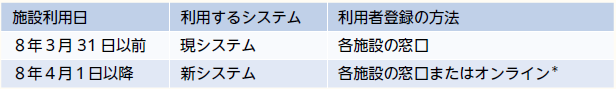 施設利用日によって、利用するシステムが異なります。それぞれに利用者登録が必要です。