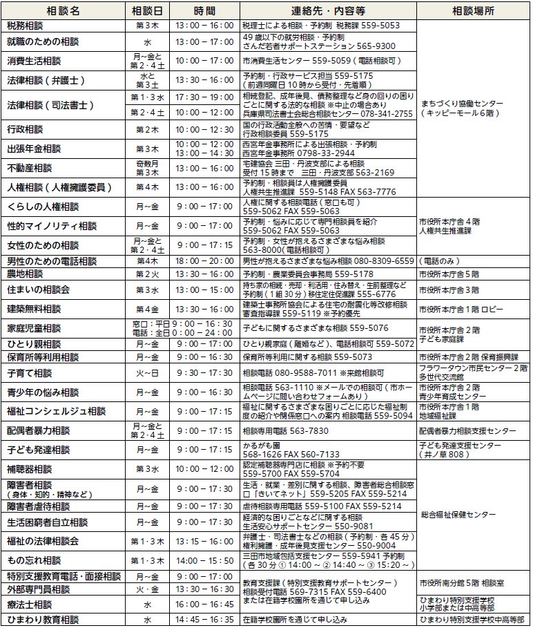 くらし 9月相談窓口・電話 26/42 前の記事 次の記事 発行日 : 2025年09月01日 自治体名 : 兵庫県三田市 広報紙名 : 広報さんだ 令和7年9月1日号 ■困ったときはご相談ください。 ※相談無料、祝日を除く ■障害者相談員 ■宝塚健康福祉事務所(宝塚市東洋町2-5) 問合せ:【電話】0797-72-0054(代) Tweet シェアする 子育てイベントをチェック 9月 子育てカレンダー(2) 9月休日診療当番医・保健だより