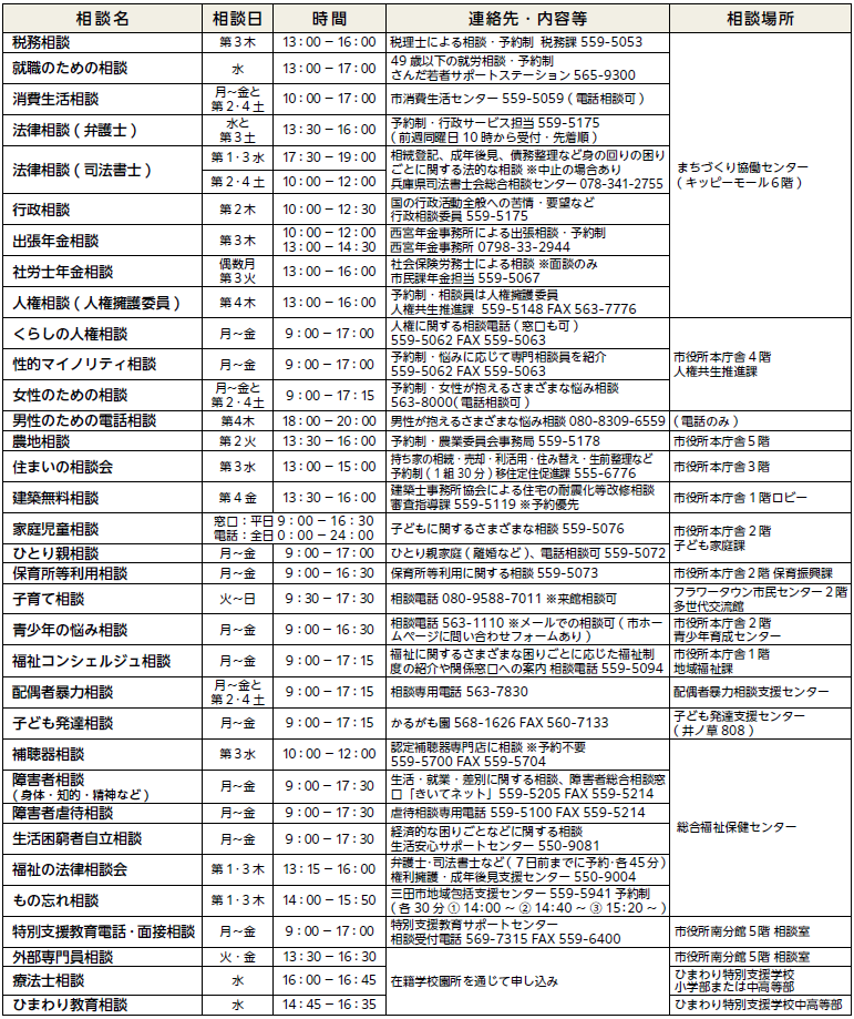 くらし 10月相談窓口・電話 26/39 前の記事 次の記事 発行日 : 2025年10月01日 自治体名 : 兵庫県三田市 広報紙名 : 広報さんだ 令和7年10月1日号 ■困ったときはご相談ください。 ※相談無料、祝日を除く ■障害者相談員 ■宝塚健康福祉事務所(宝塚市東洋町2-5) 問合せ:【電話】0797-72-0054(代) Tweet シェアする 子育てイベントをチェック 10月 子育てカレンダー(2) 10月休日診療当番医・保健だより