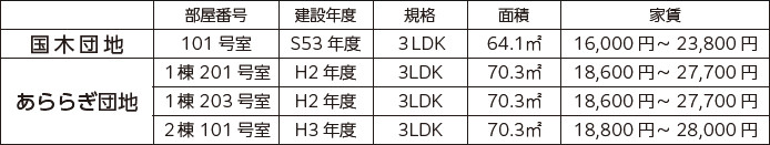 今月新たに入居者を募集する市営住宅をお知らせします。下記のほか、現在入居申込が可能な市営住宅については、お問い合わせください。(市ホームページでもご確認いただけます)