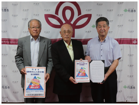 8月5日、(一社)丹波市浄化槽管理組合と「丹波市高齢者等見守りネットワーク事業」の協定締結式を行いました。地域住民や地域に密着している市内事業所の業務内の個別訪問活動を通して在宅高齢者の見守りを行う取り組みで、今回の締結を含めて35の事業所と協定を結んでいます。組合の足立一光(かずみつ)代表理事は、「日々の浄化槽の点検の際の声かけなどで見守り活動を行っていきたい」と語っていました。