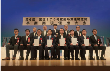 8月30日、西脇市の「オリナスホール」で、丹波市と西脇市の市民約400人が参加し、第6回国道175号東播丹波連絡道路早期実現促進大会が開催されました。大会では、地元の期待や熱い思いを伝えるために、藤井比早之(ひさゆき)衆議院議員ほか関係者に、調査中区間である西脇市黒田庄町から氷上地域間の早期事業化を求めて要望が行われました。