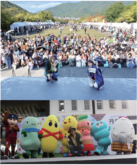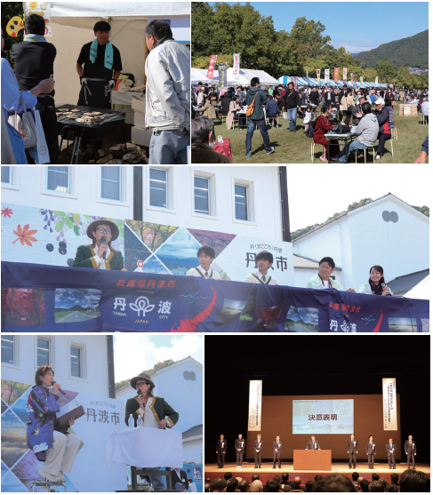 道の駅ブースでは、道の駅るもい(北海道留萌(るもい)市)のホタテ焼きが1時間待ちの大行列で昼前には売り切れるなど、どのブースも売り切れ続出の大盛況でした(上)。ステージには、観光アンバサダーの新木宏典(ひろふみ)さんが登場。氷上高校生なども出場した丹(まごころ)のやさいクイズ選手権(中央)や、もちまきなどが行われ、インスタグラマー岩田瑞希(みずき)さんが総合司会でイベントを盛り上げました(左下)。シンポジウムでは、最後に林市長による決意表明が行われました(右下)。