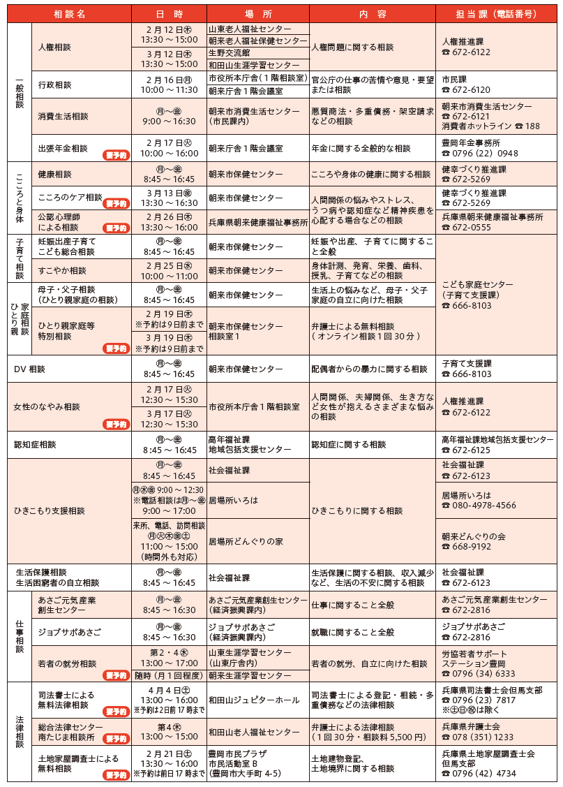 くらし 相談窓口 23/38 前の記事 次の記事 発行日 : 2026年02月05日 自治体名 : 兵庫県朝来市 広報紙名 : 広報朝来 令和8年2月号 お気軽にご相談ください。 相談日が祝日・振替休日や年末年始のときは、実施しない場合があります。 Tweet シェアする WELLNESS ふくしの窓口から~つながり便り~