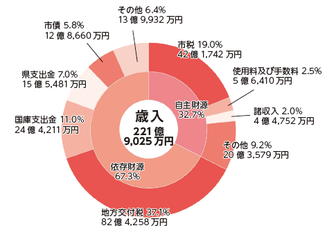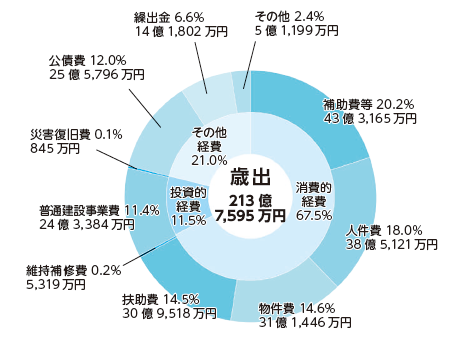 令和6年度の一般会計決算額は歳入(収入)が221億9,025万円、歳出(支出)が213億7,595万円で差引き8億1,430万円の黒字決算となりました。このうち翌年度に繰越して行う事業の財源6,178万円を差引いた7億5,252万円が実質的な黒字となります。