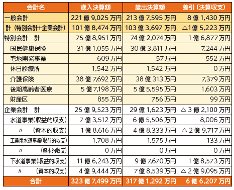令和6年度の特別会計と企業会計をあわせた決算総額は、歳入(収入)101億8,474万円、歳出(支出)103億3,697万円となり、決算収支では水道事業会計の資本的収支および下水道事業会計の資本的収支を除いて黒字もしくは歳入と歳出が同額となりました。