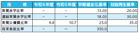 ※実質赤字額・連結実質赤字額がないため「-」と表示しています。将来負担比率について、公債費充当可能財源等が将来負担額を上回り、比率が算定されないため「-」と表示しています。