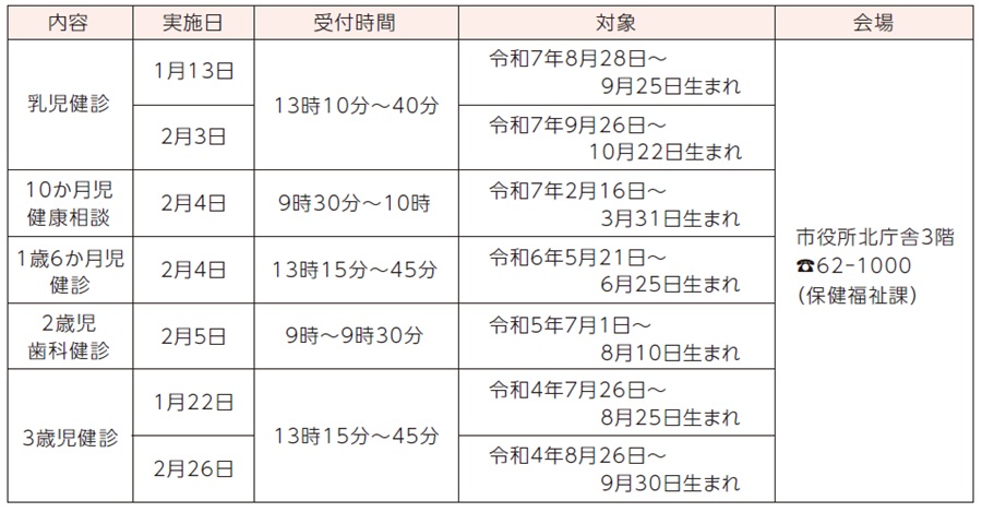 1月、2月の乳幼児健診の日程です。