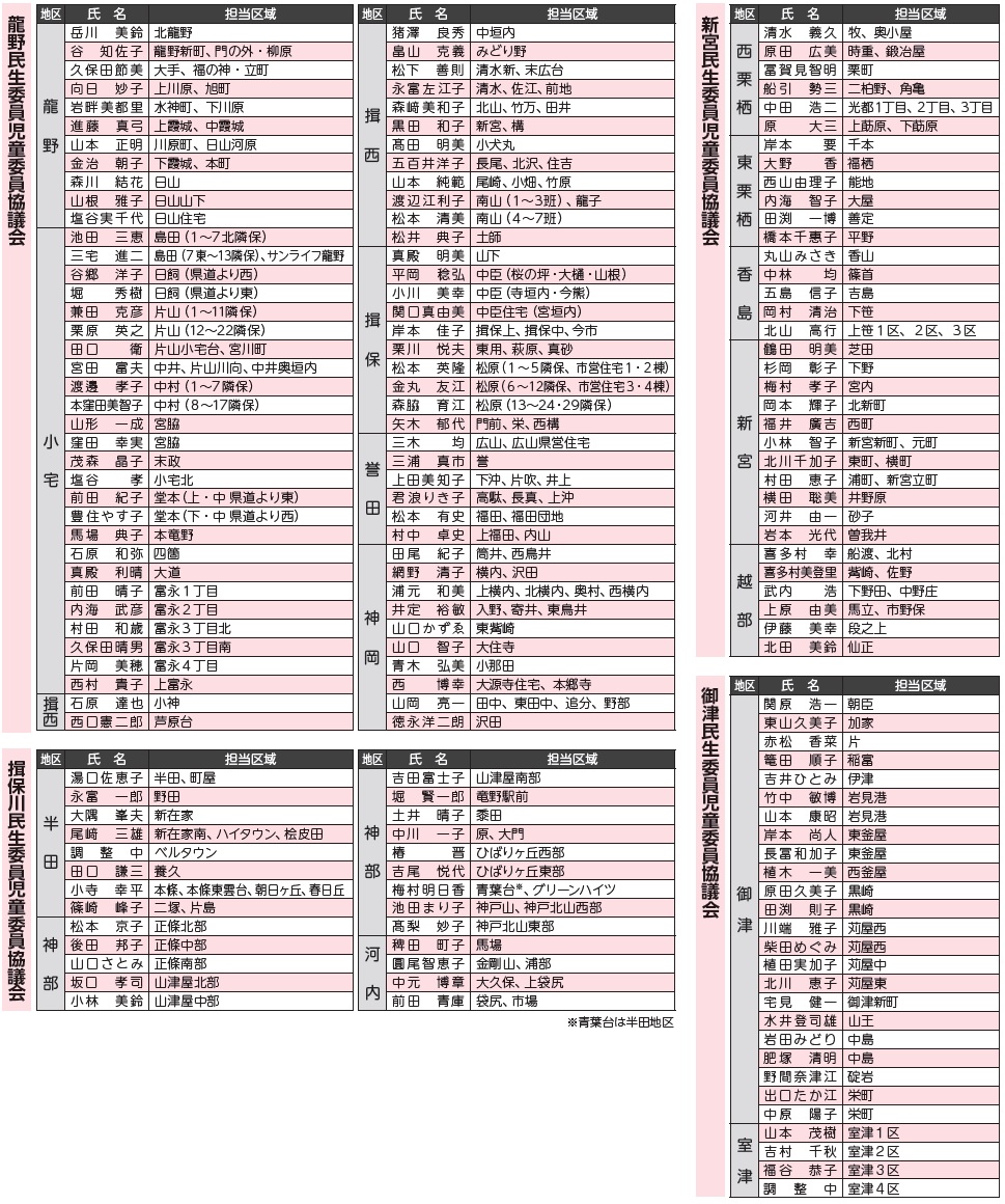 民生委員・児童委員は、担当区域をもち、地域住民の身近なところで、高齢者、障害者、ひとり親家庭、児童問題など、援助が必要な方々の立場に立った相談・支援活動を行います。主任児童委員は、特に児童や児童のいる家庭など児童問題を専門的に担当します。これから3年間、市民の皆さまの身近な福祉の相談役として活躍されます。相談に関するプライバシーは保護されますので、お気軽にご相談ください。なお、各委員の連絡先については、下記事務局までお問い合わせください。
