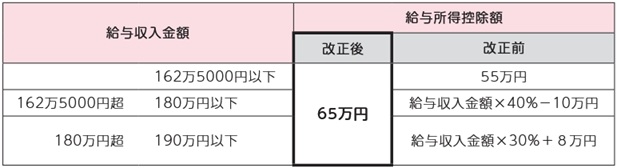 給与収入金額が190万円以下の給与所得控除の最低保障額が、最大10万円引き上げられます。