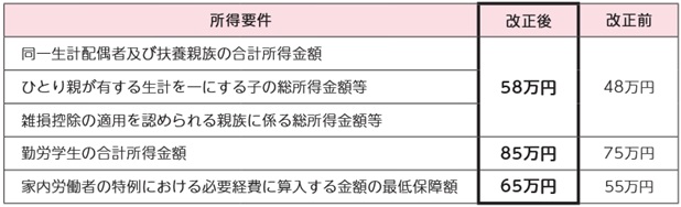各種扶養控除等に係る合計所得金額の所得要件が、以下のとおり引き上げられます。