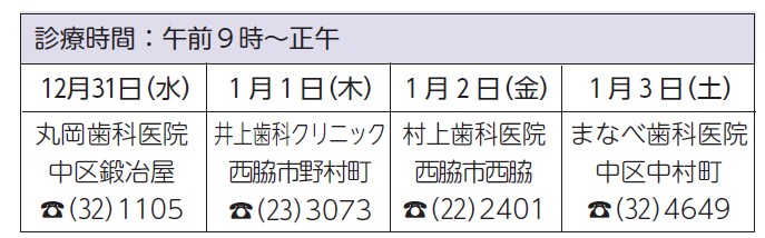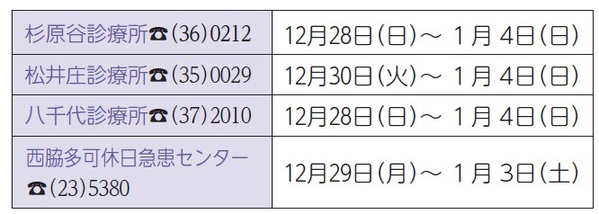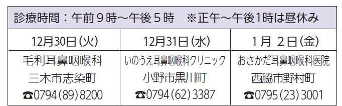 ※西脇市多可郡医師会のホームページで、開業医の年末年始診療日が掲載される予定です。