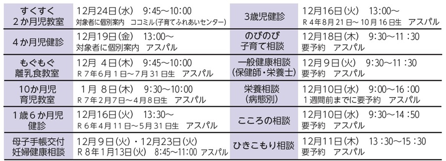 子育て 母子保健事業と健康づくり事業 25/54 前の記事 次の記事 発行日 : 2025年12月01日 自治体名 : 兵庫県多可町 広報紙名 : 広報たか 2025年12月号 問合先:健康課 【電話】32-5121 Tweet シェアする 相談窓口 加東健康福祉事務所相談事業※要予約