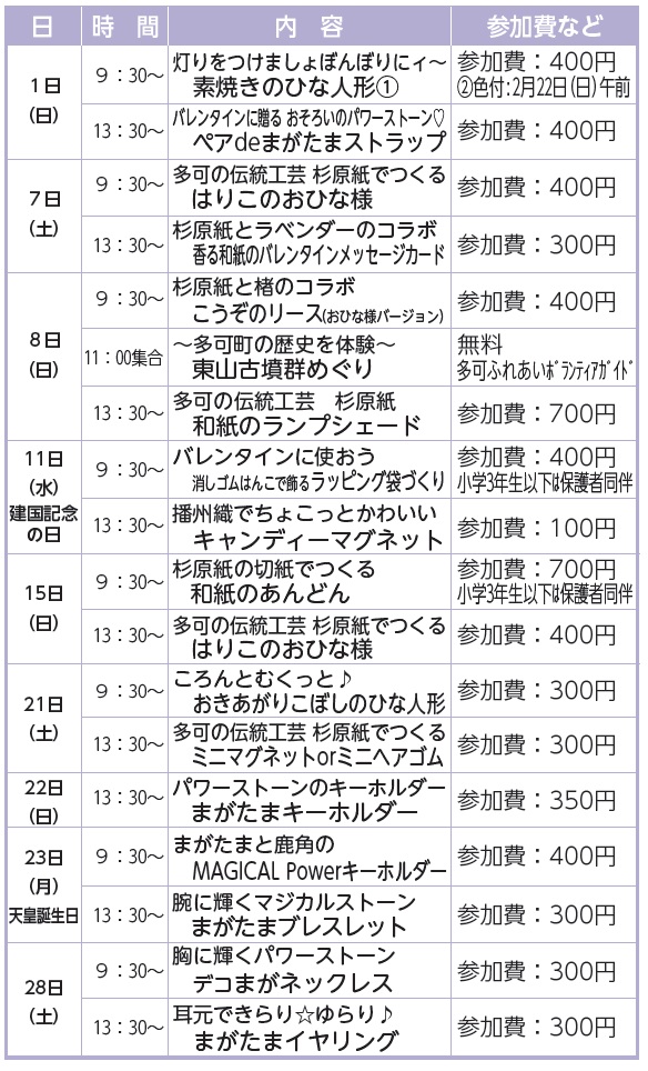 イベント 那珂ふれあい館 2 月のイベント 37/55 前の記事 次の記事 発行日 : 2026年02月01日 自治体名 : 兵庫県多可町 広報紙名 : 広報たか 2026年2月号 体験Web申し込みはこちらから ※二次元コードは、本紙をご覧ください。 問合せ:那珂ふれあい館 【電話】32-0685【FAX】30-2730 Tweet シェアする 女性防災チームからのおたより(12) 『いつも通りの暮らし』を守るために 12月の入札結果
