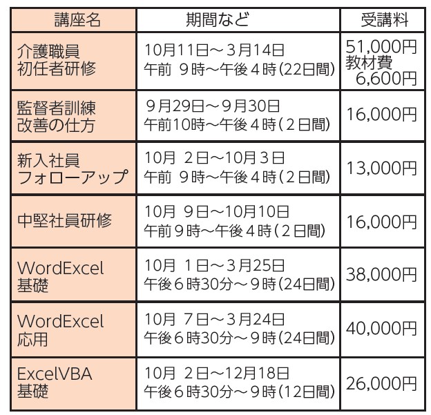 ※受講料は税込みです。申し込みなど詳細はお問い合わせください。