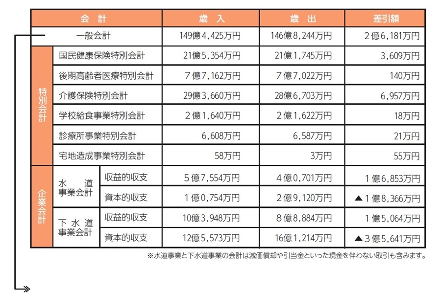 決算の中心となる一般会計は、歳入が149億4,425万円、歳出は146億8,244万円となり、歳入と歳出の差引額は2億6,181万円となりました。