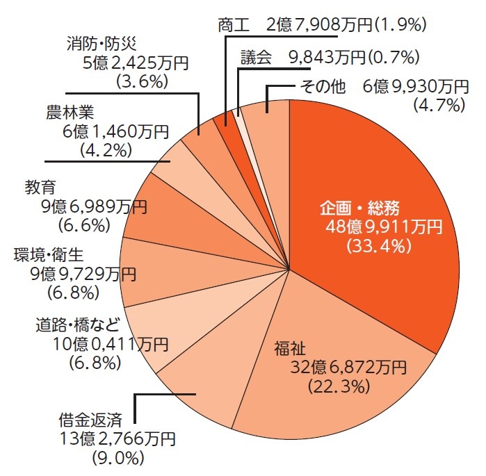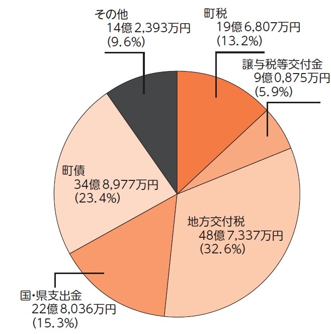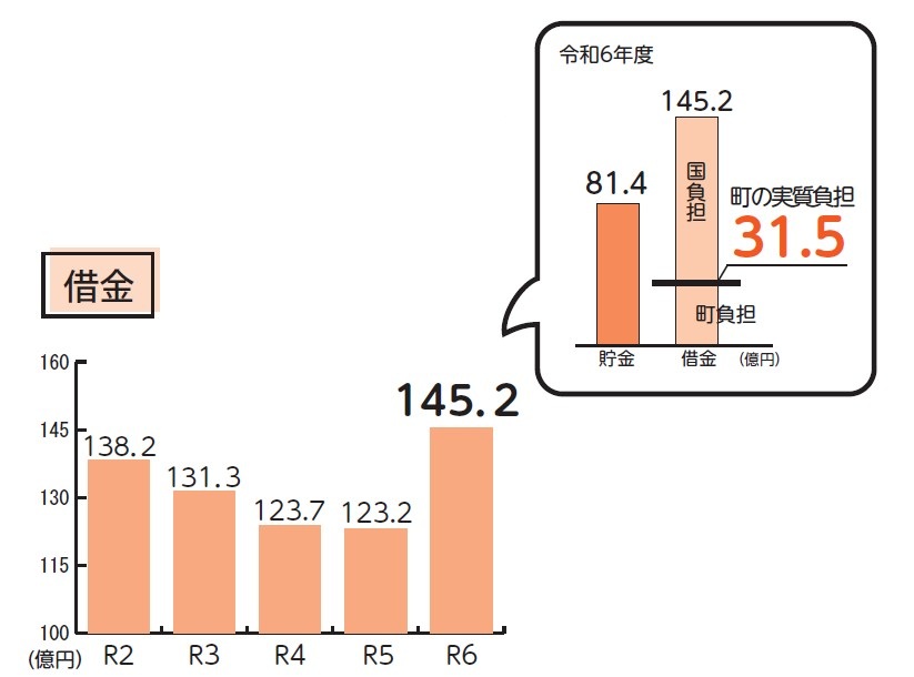 町の借金に当たる町債残高(一般会計分)は、145億1,840万円となり、前年度から増加となりました。町債残高のうち、過疎対策事業債や旧合併特例事業債などの町債には国の負担分があり、それを差し引いた町の実質的な負担は31億4,990万円となります。