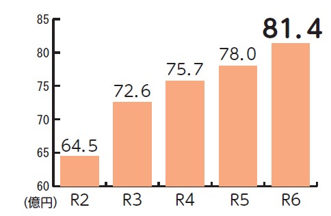 町の貯金にあたる基金(一般会計分)は、81億3,708万円となり、前年度より増加となりました。