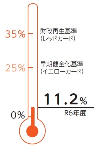 収入に対する借金返済額の割合を表す「実質公債費比率」は、11.2%であり、早期健全化基準である25%を大きく下回っています。