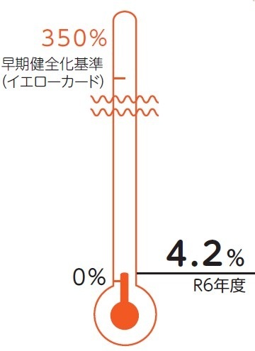 収入に対して一般会計が将来負担すべき借金などの割合を表す「将来負担比率」は、4.2%であり、早期健全化基準である350%を大きく下回っています。