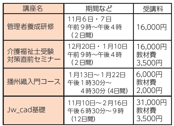 ※受講料は税込みです。申し込みなど詳細はお問い合わせください。