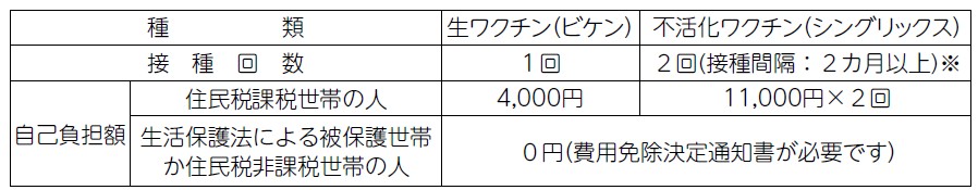 ワクチンの種類と自己負担額: