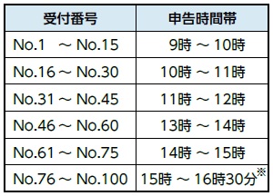 今年も昨年同様に混雑を避けるため、受付番号札の配布を行います。役場の申告会場は非常に混雑しますので、受付件数の制限を設け、1日100件までとします。なお、8時30分から就業改善センター入口で、当日の受付番号札の配布を行います。受け取られた番号札の申告開始時間の目安は右のとおりです。