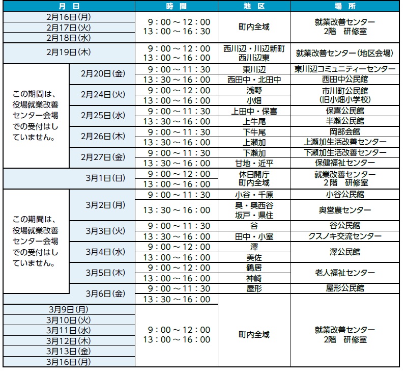 令和7年分の所得税及び復興特別所得税の確定申告及び令和8年度住民税申告の受付について、町では13ページのとおり申告会場を開設します。