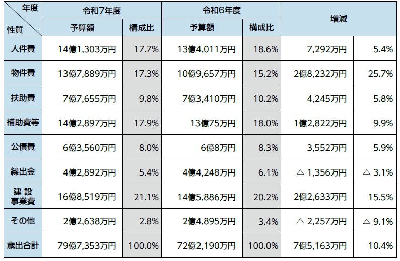 一方、歳出面においては、町制施行70周年関連事業、各公共施設老朽化対策事業などの建設事業費をはじめ、次期ごみ処理施設整備事業、消防署建設事業にかかる負担金等の増加により、普通会計全体では前年度に比べ7億5,162万円(対前年比10・4%)増の79億7,353万円となっています。
